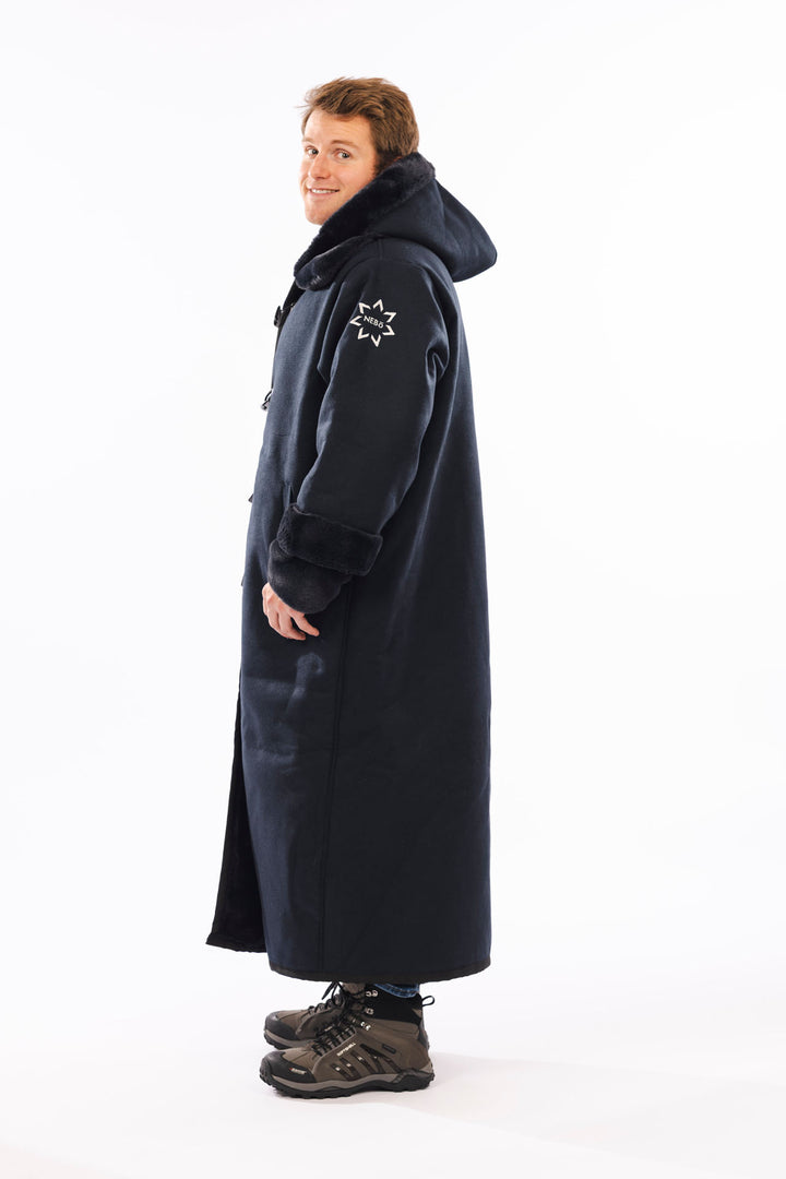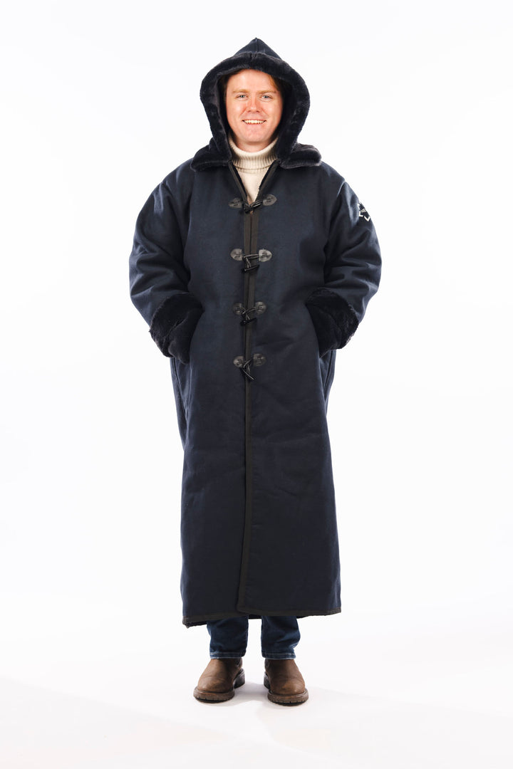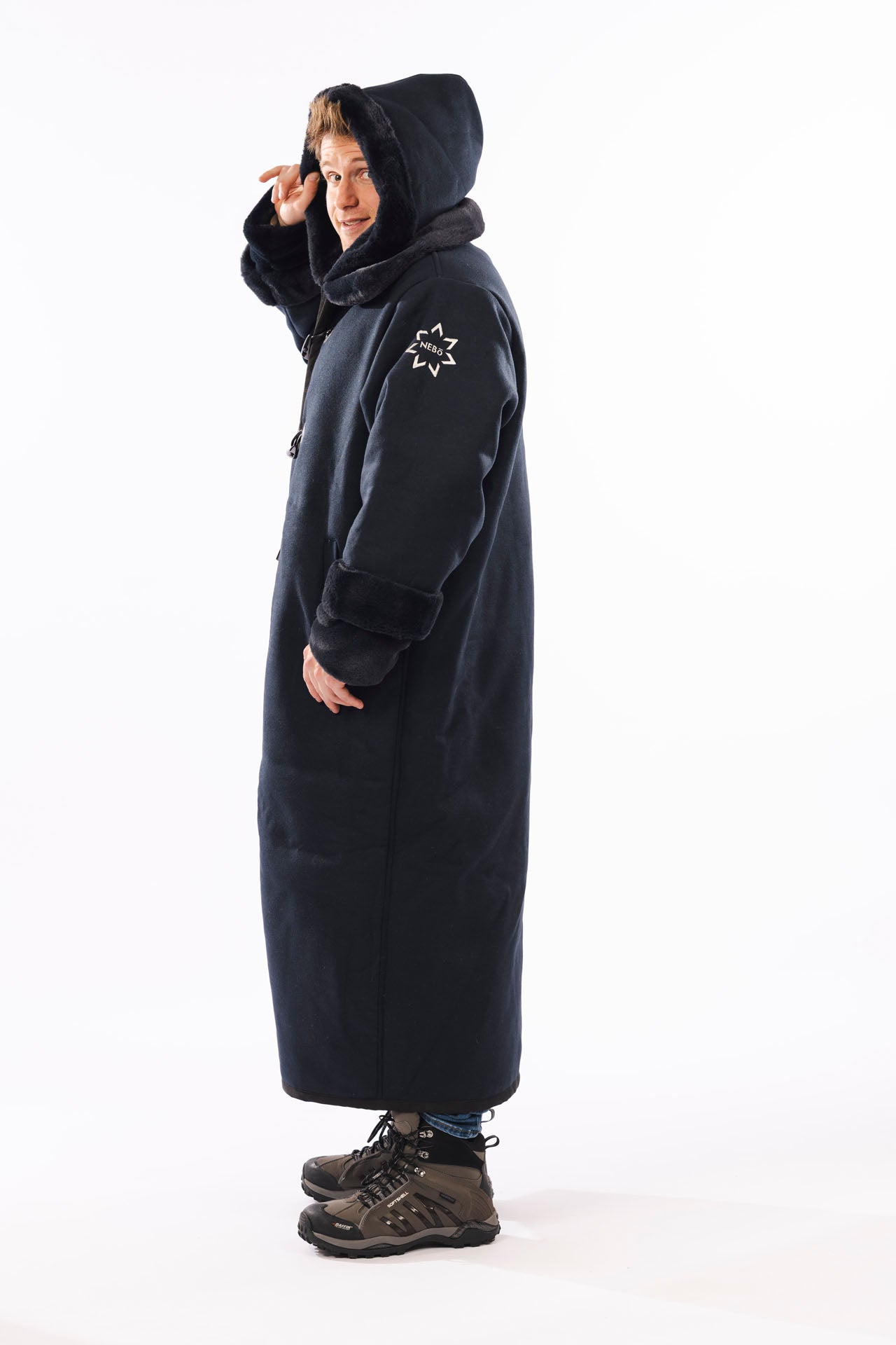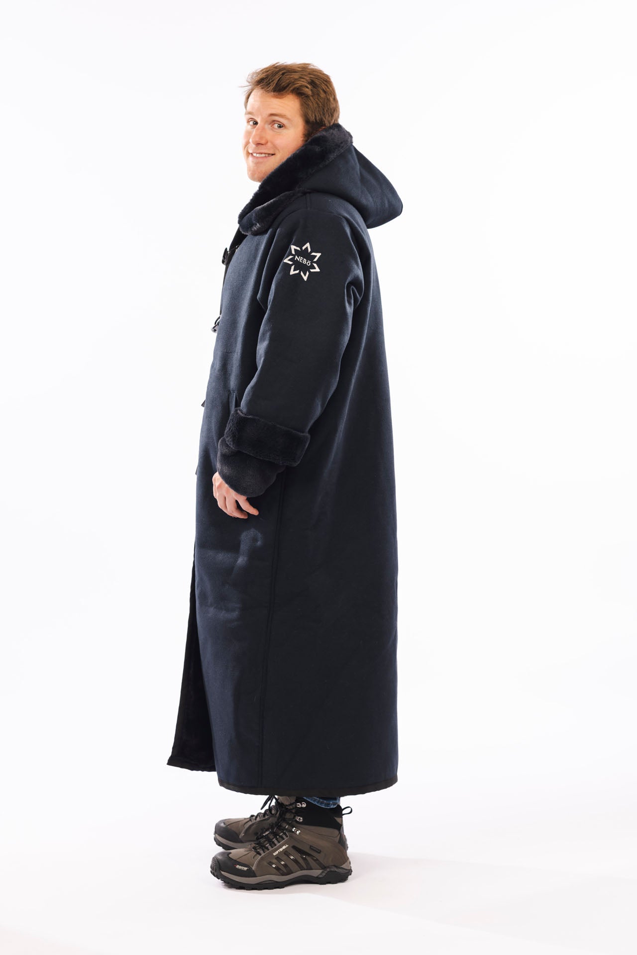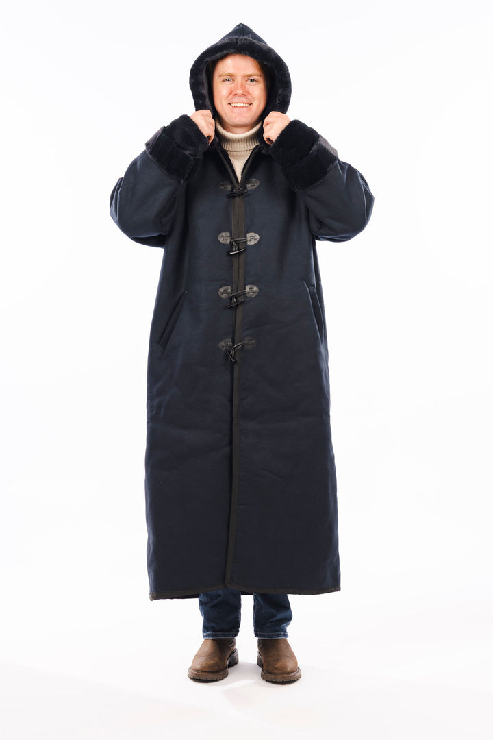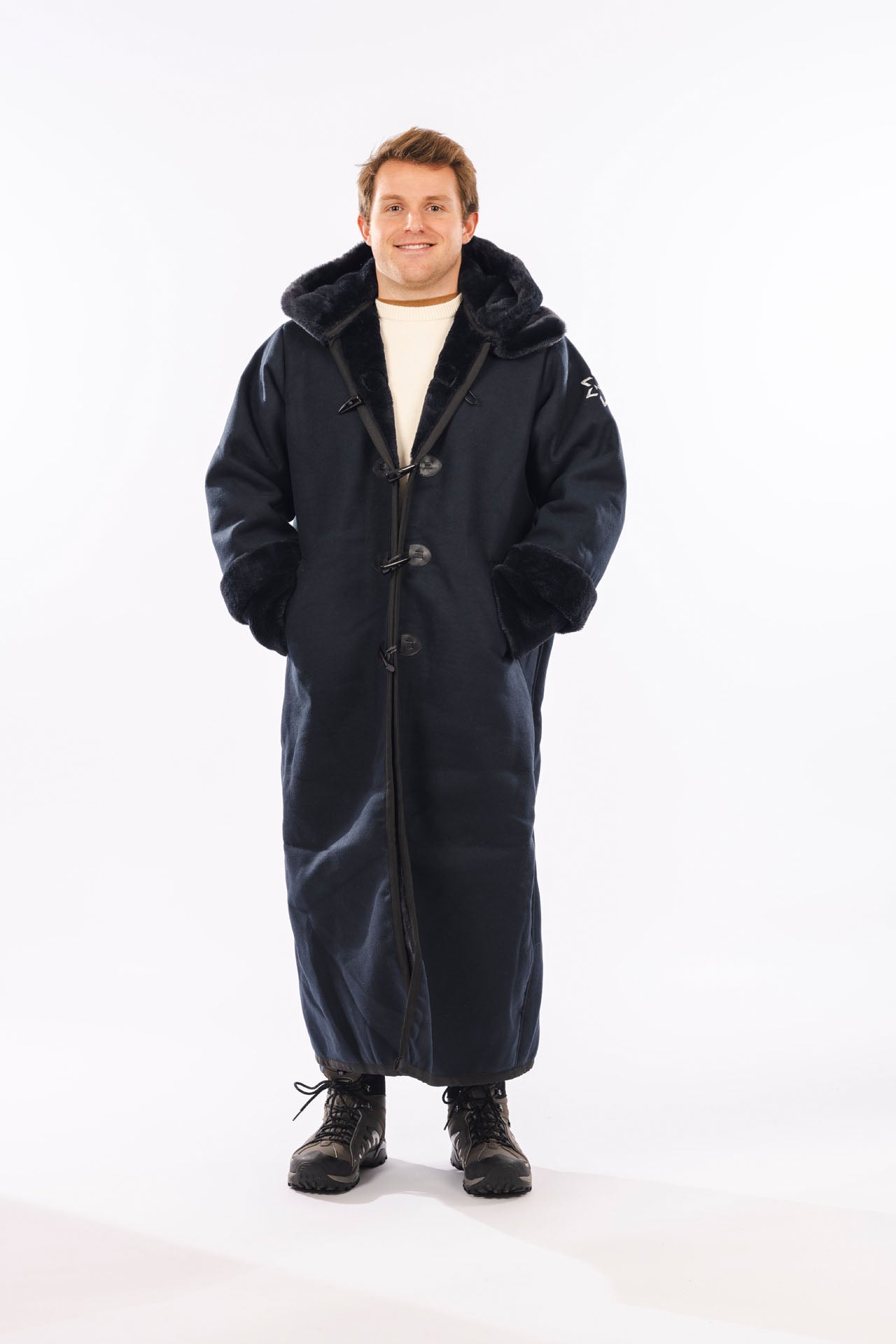 Crafted from an exclusive blend of premium wool and cutting-edge microfibers, this windproof, full-length coat is your shield against the cold and your emblem of camaraderie in winter's joyous moments. Featuring bespoke natural toggle buttons, deep side pockets for cozy gatherings, thumb holes for added warmth, a protective head covering, and innovative adjustable/removable Velcro leg straps to lock in heat, this coat is your warm embrace after every epic winter tale.