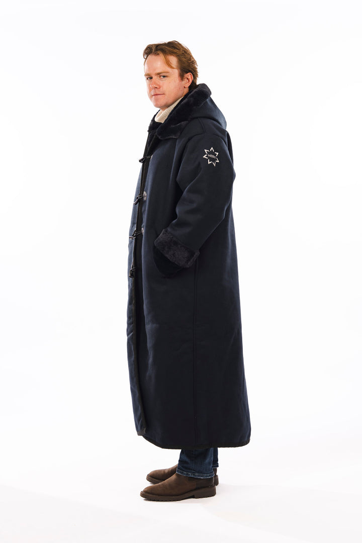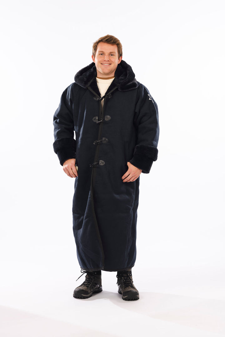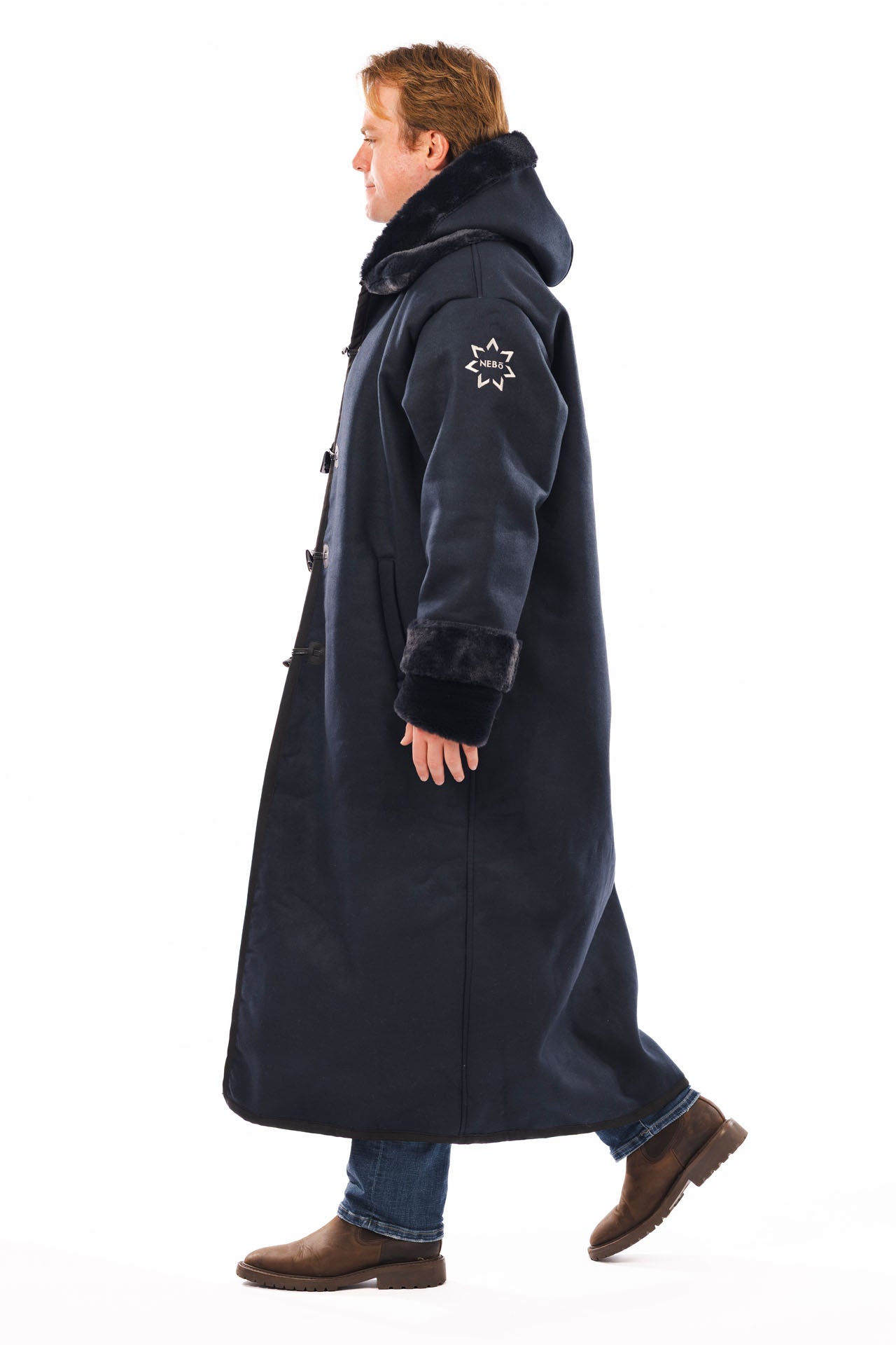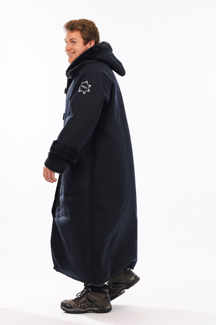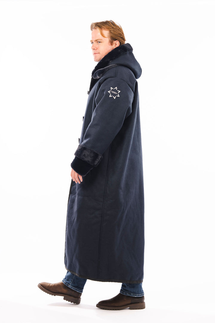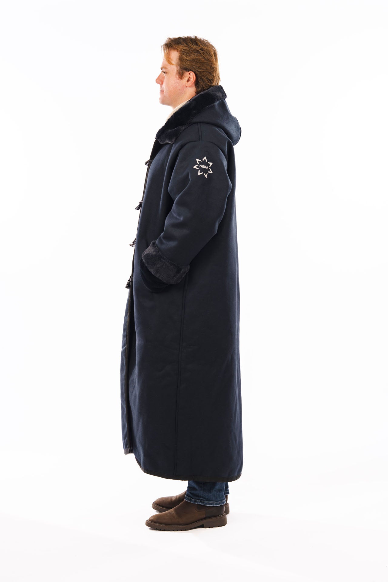 Crafted from an exclusive blend of premium wool and cutting-edge microfibers, this windproof, full-length coat is your shield against the cold and your emblem of camaraderie in winter's joyous moments. Featuring bespoke natural toggle buttons, deep side pockets for cozy gatherings, thumb holes for added warmth, a protective head covering, and innovative adjustable/removable Velcro leg straps to lock in heat, this coat is your warm embrace after every epic winter tale.