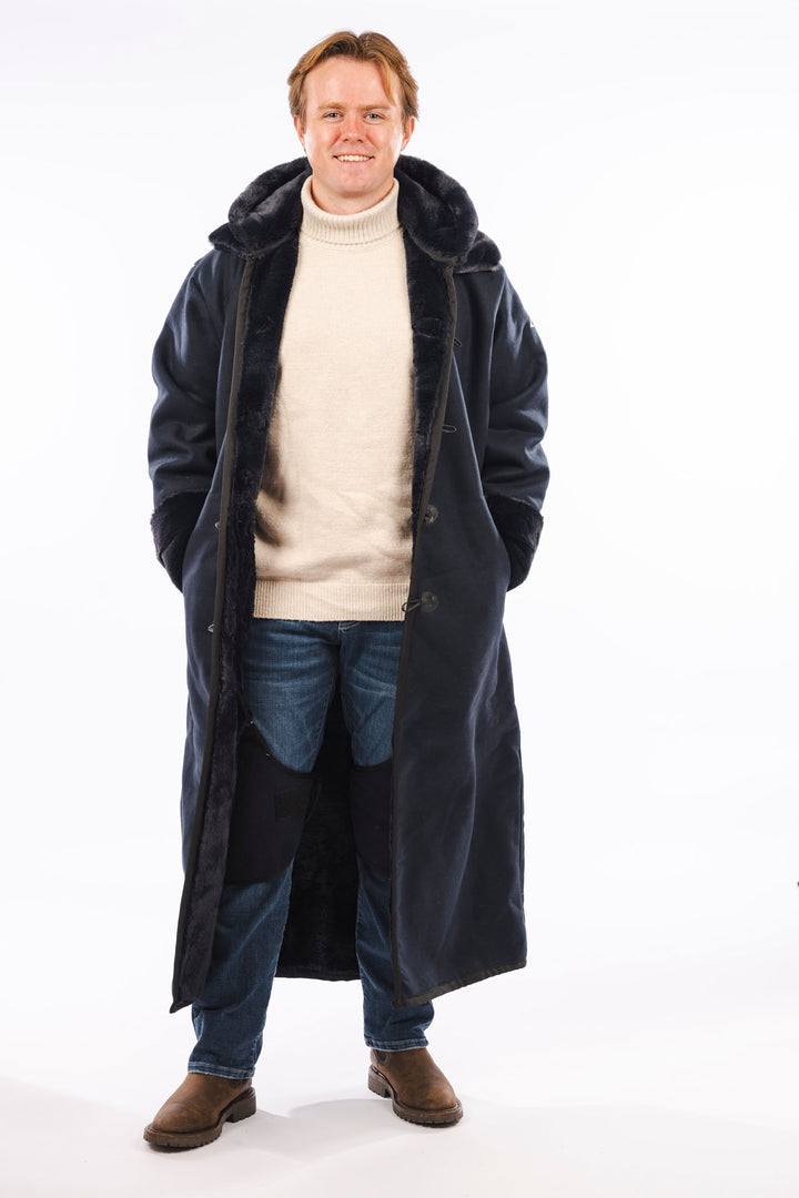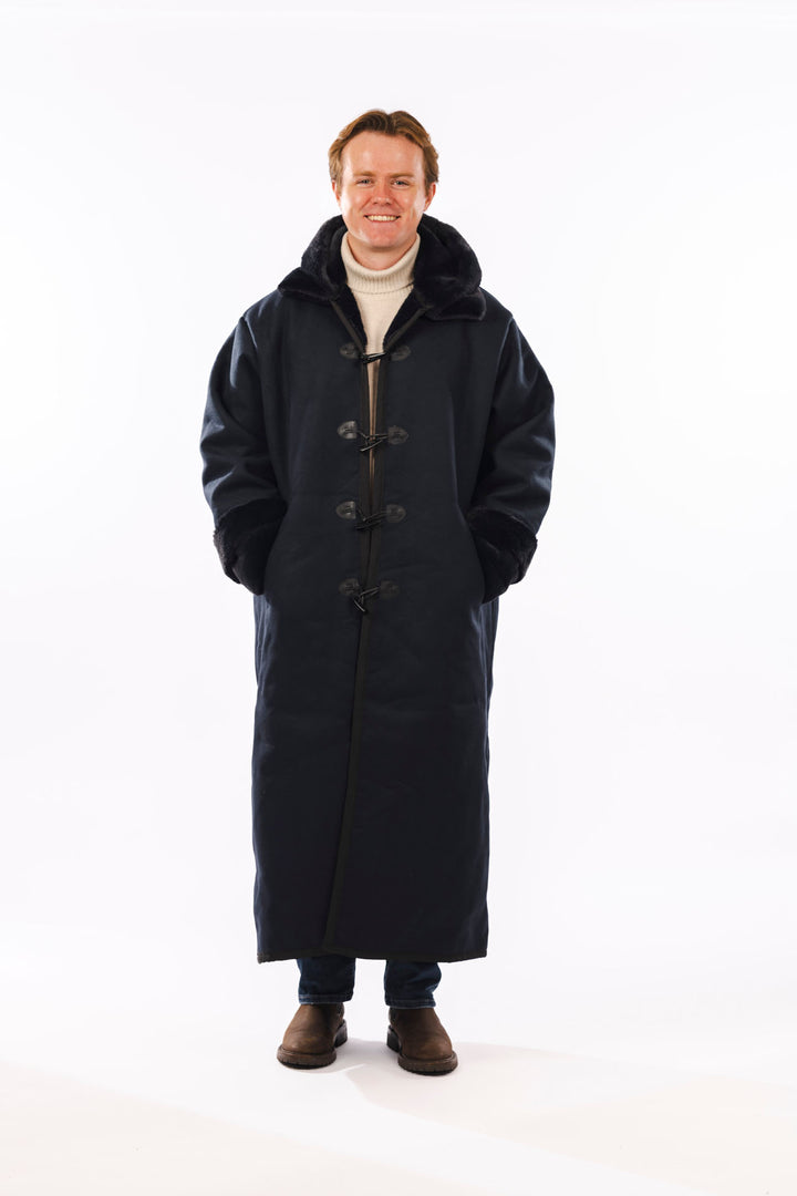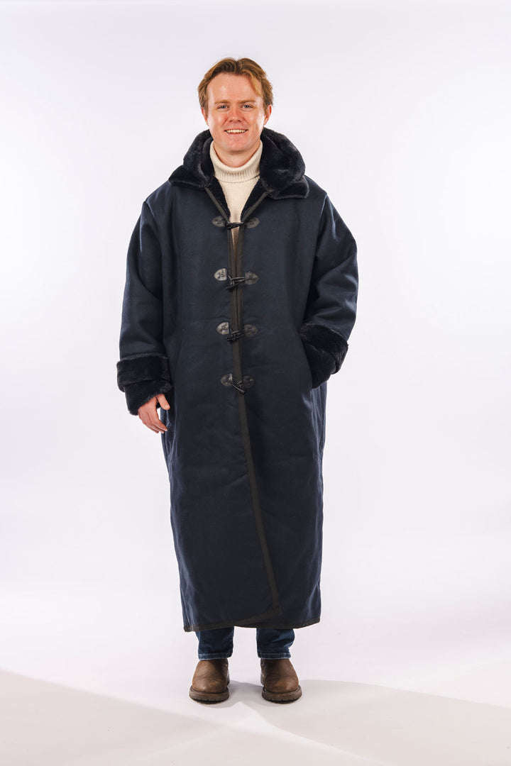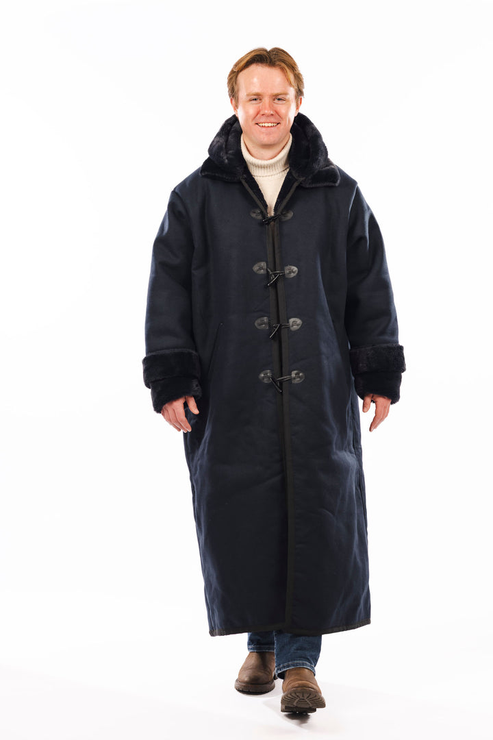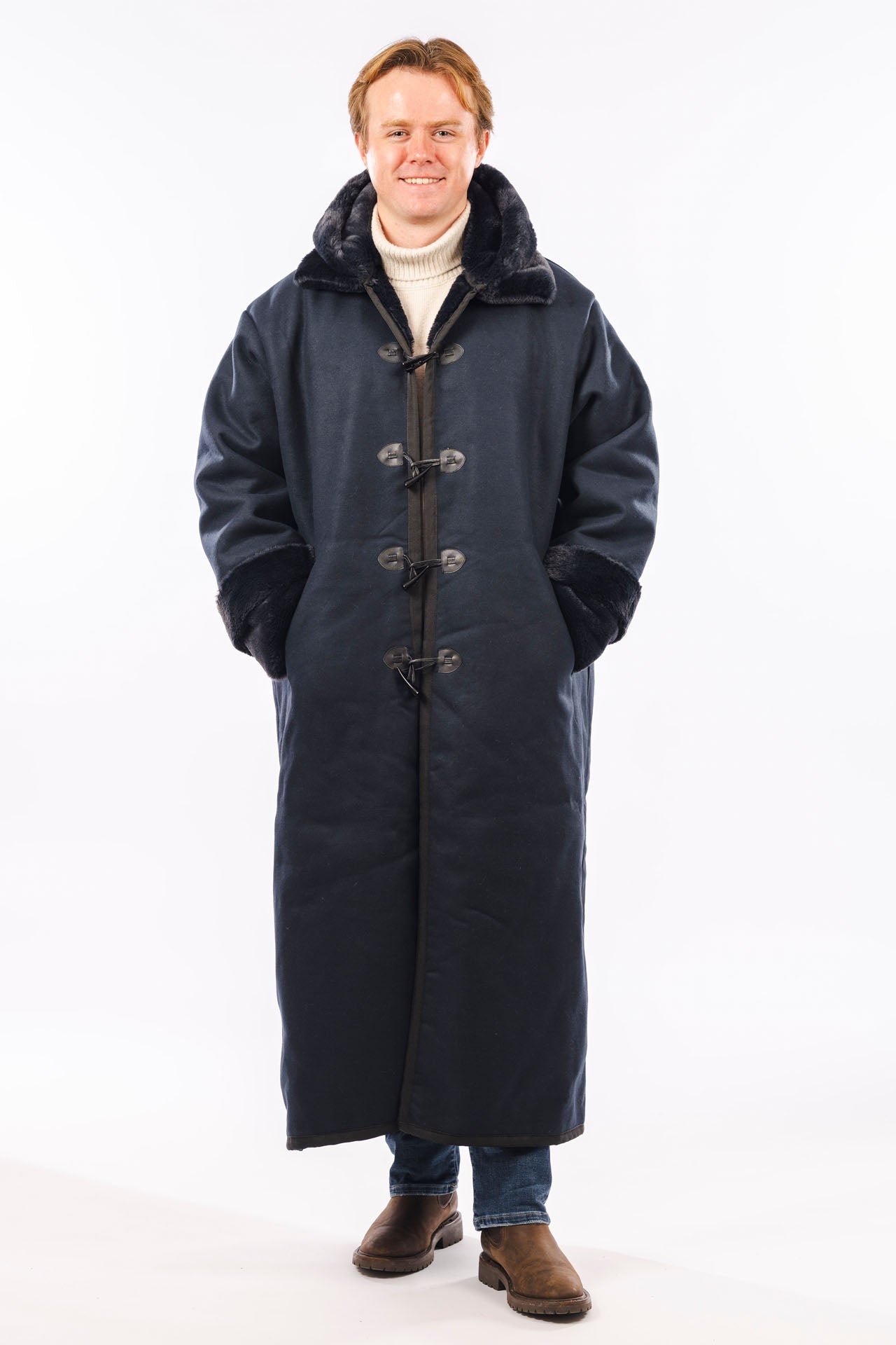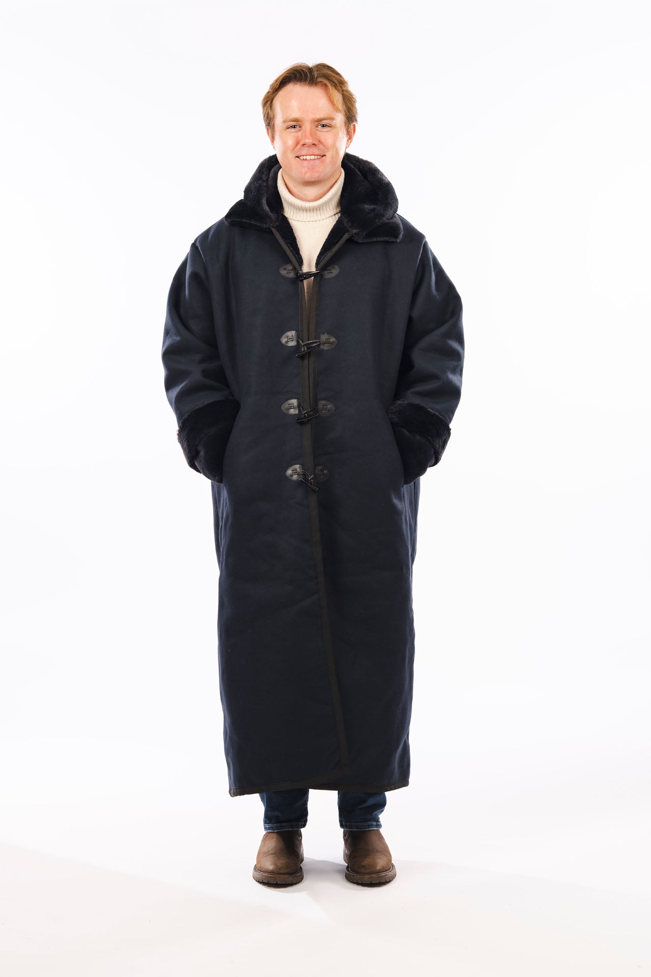 Crafted from an exclusive blend of premium wool and cutting-edge microfibers, this windproof, full-length coat is your shield against the cold and your emblem of camaraderie in winter's joyous moments. Featuring bespoke natural toggle buttons, deep side pockets for cozy gatherings, thumb holes for added warmth, a protective head covering, and innovative adjustable/removable Velcro leg straps to lock in heat, this coat is your warm embrace after every epic winter tale.